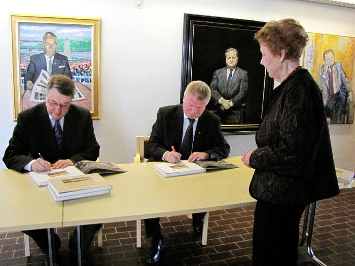 lehdistötilaisuus WPK-talossa. Kaupunginjohtaja Hannu Komonen sai kirjan
