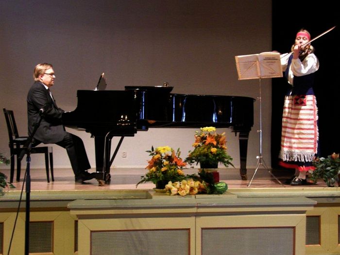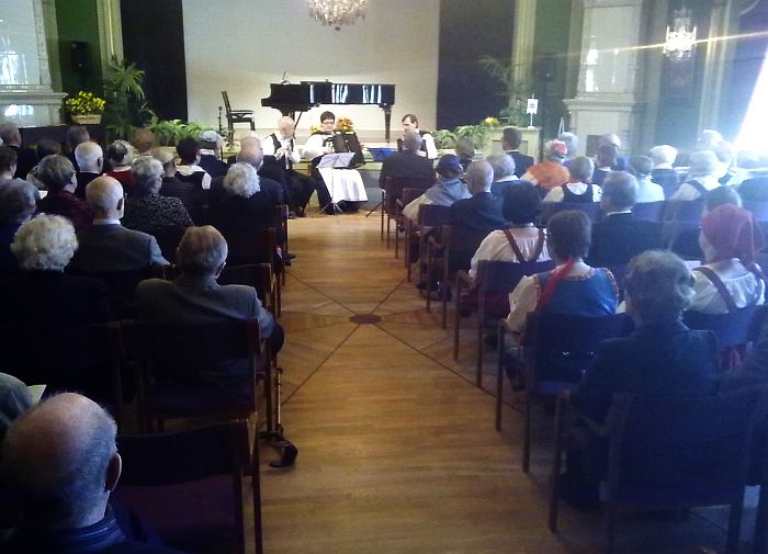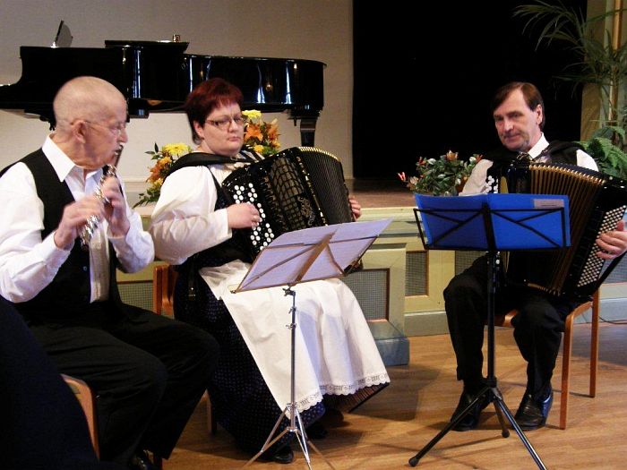 Juhlapuheen jälkeen siirryttiin eri musiikkilajiin, kun Heli Hakokivi ja Jaakko Järvinen hanureineen ja Veli Häkkinen huiluineen aloittivat viihdyttävän musiikkihetken valssin, sottiisin ja masurkan myötä.