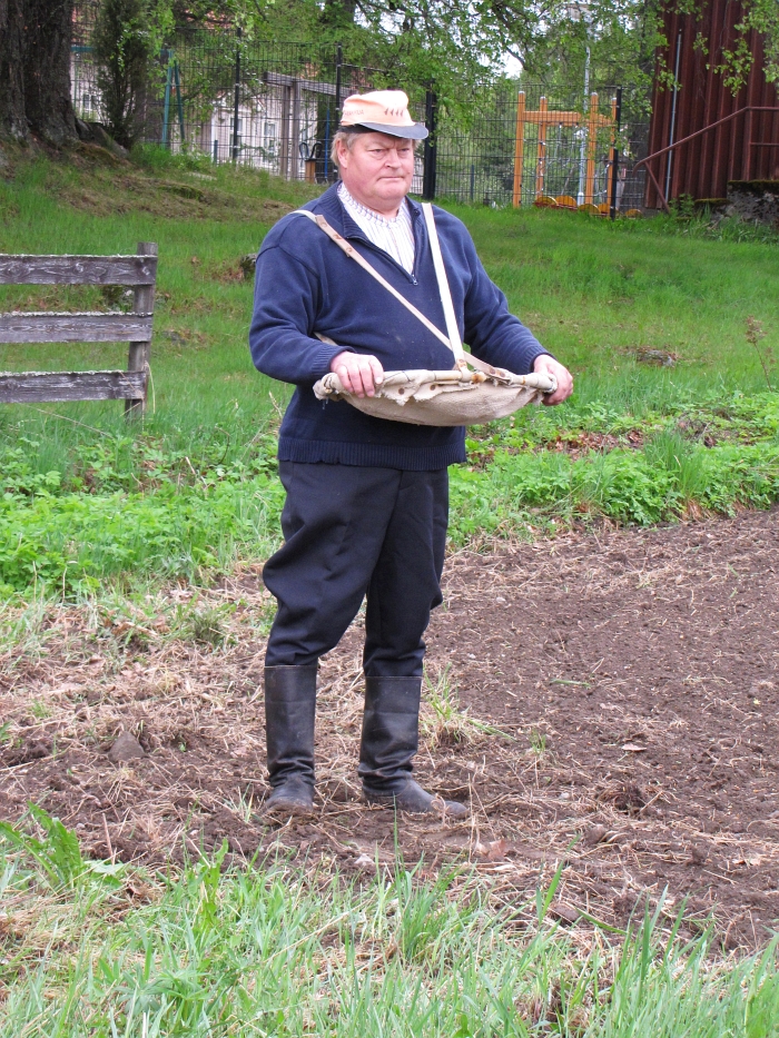 Aamuinen tihkusade oli valmistanut Lusin koulun vieressä olevan pellon otolliseen kylvökuntoon. Veijo Sipilä (kuva) vakkoineen suoritti vastuullisen kylvötehtävän Veikko Mäkelän vakasta, josta se oli tehty joka kerta. Verkkaisen kylvön aikana rovasti Ahti Peltonen siunasi sekä tämän kylvön että eri puolilla Heinolaa tapahtuvan kylvön ja kasvun.