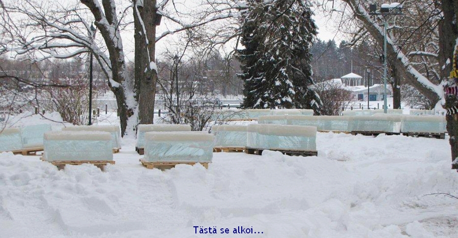 oli käytössään 16 jääpalaa. Yksi pala painoi 250 kg. Näistä aihioista