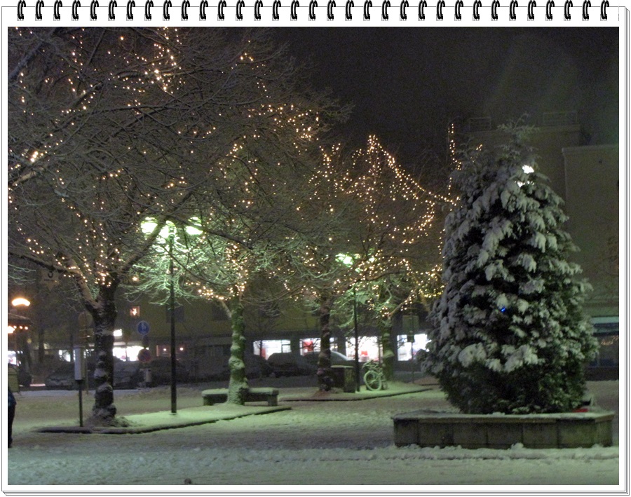 valaistu. Mutta lunta tuprutti, lumen peittämät valkoiset pöydät