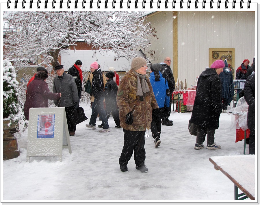 Vieraita kuhisi pöytien ympärillä. Sitten tontut lumisateessa