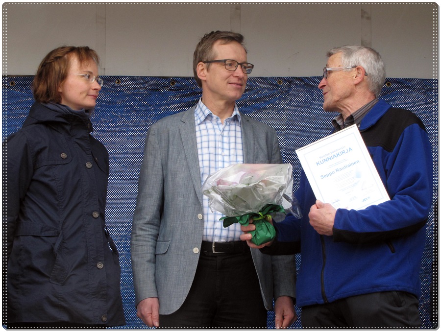 Kunniakirjan ja kukkakimpun Rautiaiselle ojensivat Kristiina Laitinen Heinolan Nuorkauppakamarin ja Heikki Mäkilä kaupungin edustajana.