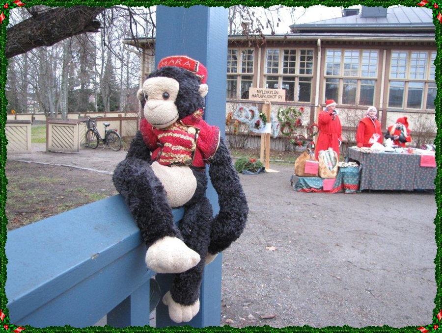 Letkeän rennosti istuskelee posetiivarin Mara-apina esiintymislavan kaiteella. Ihmettelee väen paljoutta ja myyjien herkullisia pöytiä.