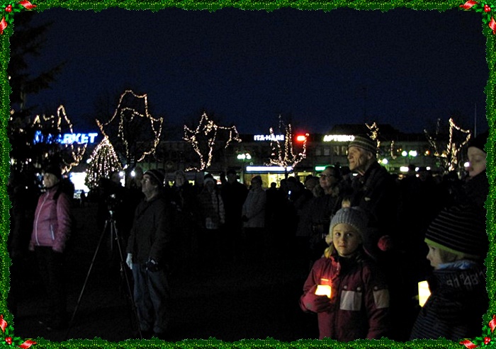”Tuiki, tuiki tähtönen” -laulun aikana syttyivät valot Rantapuiston kuusiin ja puistokäytävän valokatto valaisi koko tienoon. Eeva Rantalan kertoman Kuusen tarinan jälkeen lähdettiin kulkueena torille jatkamaan juhlailtaa ja sytyttämään joulupuukaupungin valot.