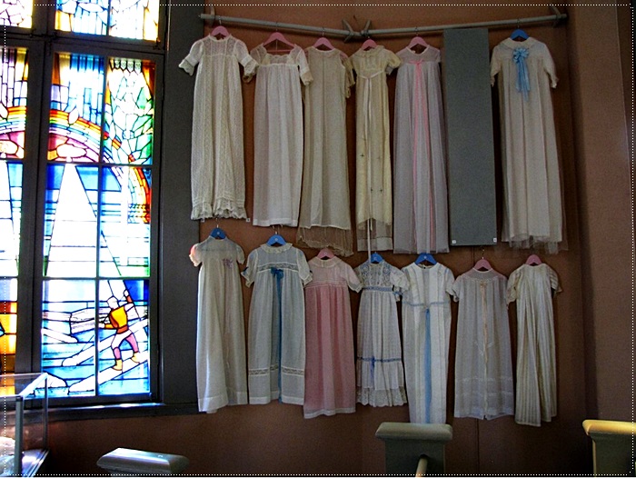 100 erilaista ja eri-ikäistä, eri perheiden ja sukujen kastemekkoa.