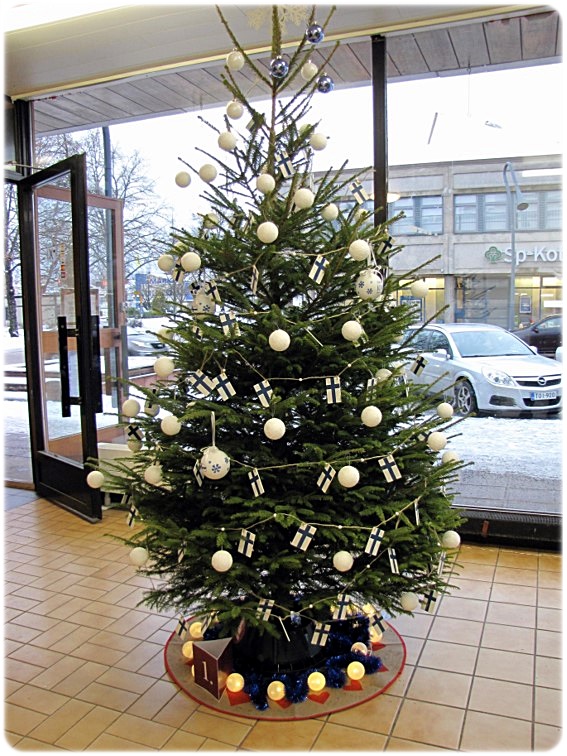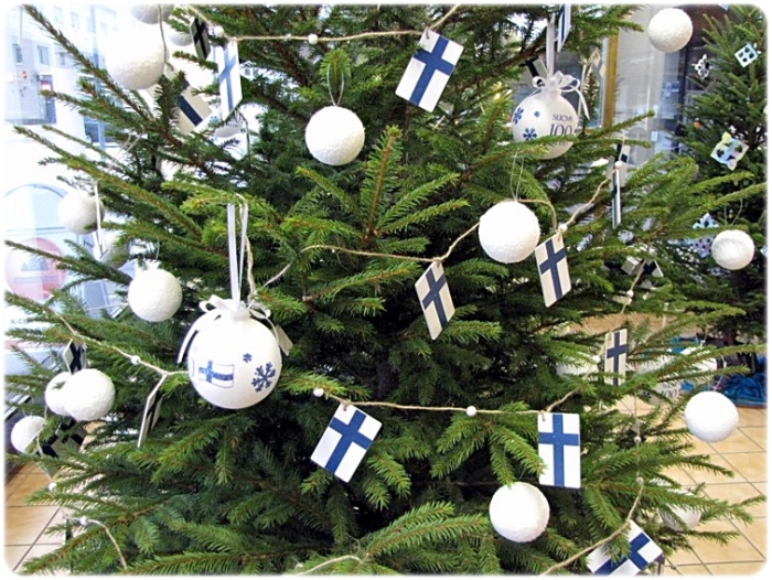 Juhlavuoden kuusi siniristilippuineen