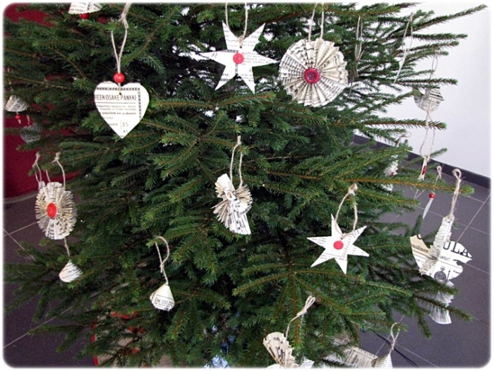 omin käsin sanomalehtimäisestä materiaalista tehtyjä koristeita, joita