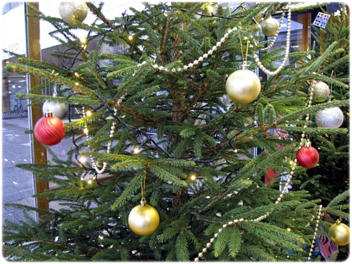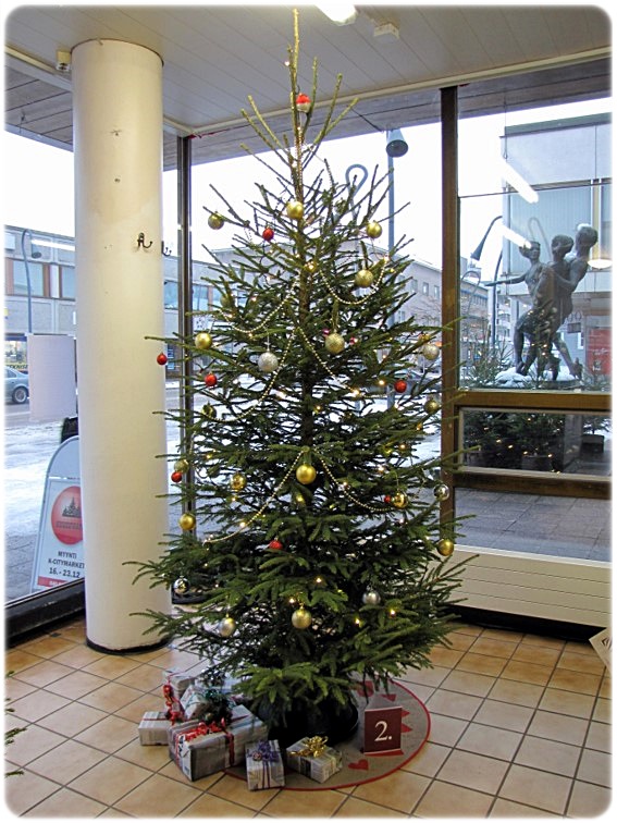 kulta- ja hopeapalloin koristelema kuusi, valintoja 60. Lahjapaketit